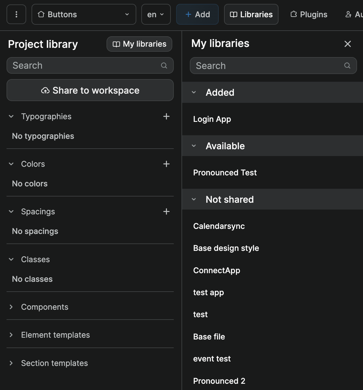 For example, here, I’m on the Buttons page of the Base Design components project and it looks like the typography of the buttons is bound to the Login app library: