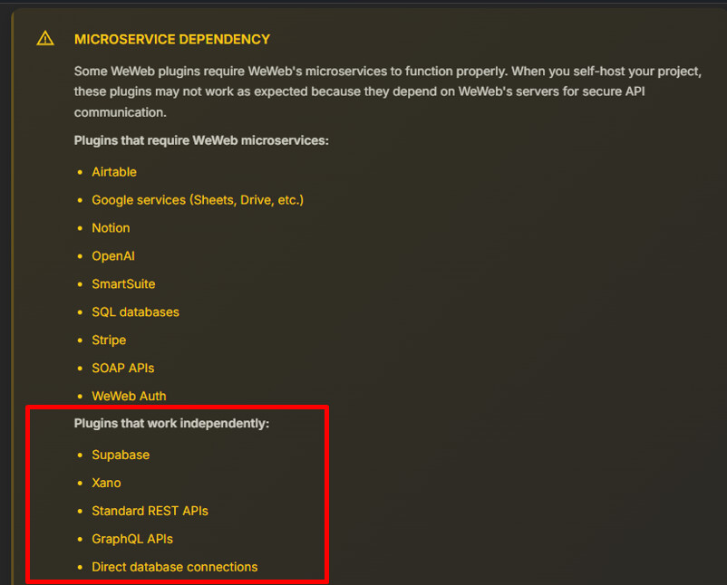 For now in my WeWeb project i use only Supabase Data and Supabase Auth Pluggins and i am not planing to add other things. i dont see in this documentation anywhere to mention that i need WeWeb server or something else for Self-Hosted if i use only Supabase plugins.